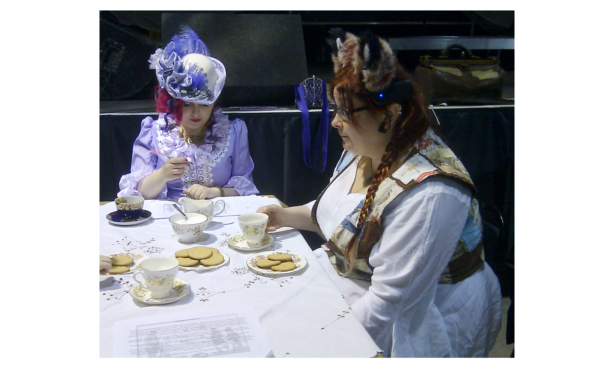 The reason for this was the Tea Duelling. I gather there’s some kind of schism between American and British steampunks about what tea duelling entails (given what happened last time we had a disagreement about tea, I find this a bit ominous, but fortunately even the most bellicosely uniformed steampunks seem to be quite good-humoured) – with one faction insisting that the sport is mainly a test of nerve and manual dexterity in dunking a biscuit and conveying it to the mouth without undue crumbling or drips, whereas the Welsh Imperium rules value a clean cup, a neatly furled pinky finger and the ability to absorb multiple biscuits while making more or less sparkling conversation. We were playing by Welsh Imperium rules, which was handy, as manual dexterity is my dump stat.