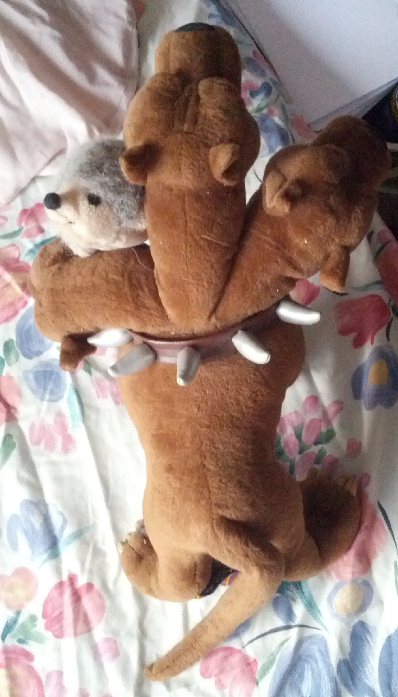 Today while making a somewhat doomed attempt to tidy the house I noticed that the general confusion of soft toys in my bedroom had produced a tableau in which Cerberus, Guardian of the Underworld, appeared to be carrying off a small grey-furred hedgehog.